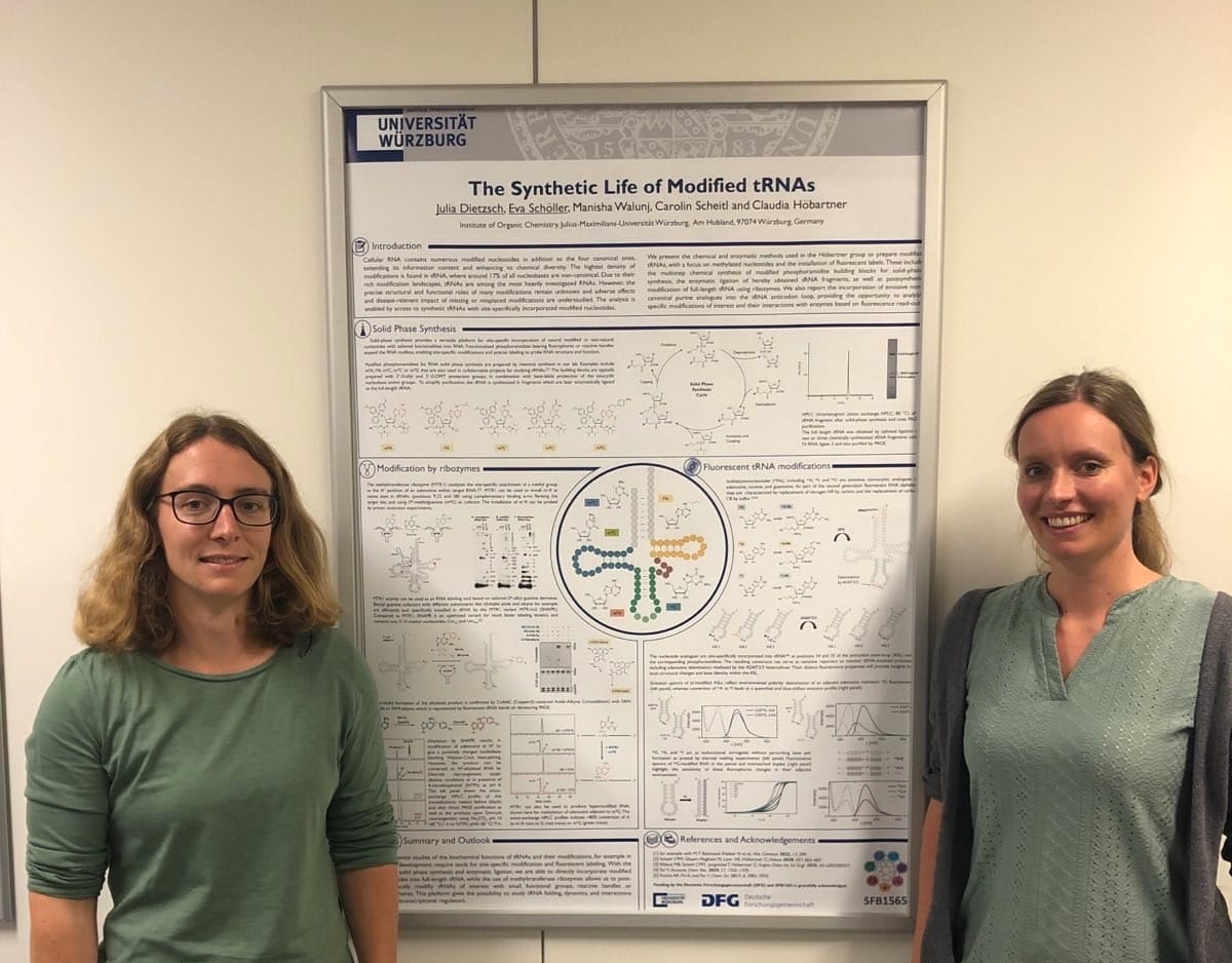 As Members of the Collaborative Research Center SFB1565, Claudia Höbartner, Julia Dietzsch and Eva Schöller participated at the meeting and presented their research findings. The two postdocs convinced the jury with their poster "The Synthetic Life of Modified tRNAs" on which they explained the methods developed in the Höbartner lab to prepare unmodified and modified tRNAs.