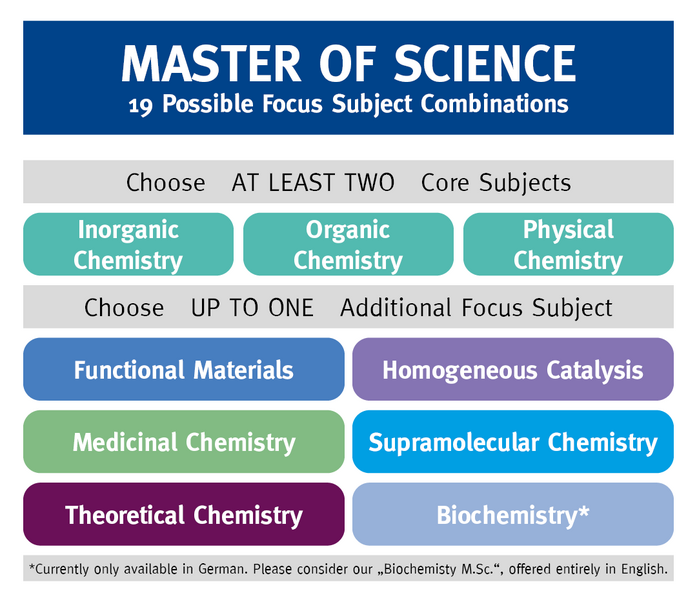 As part of the master's programme here in Würzburg, you will choose three from our nine focus subjects in which to specialize. At least two of these must come from the core subjects: inorganic, organic and physical chemistry. You do not have to choose the focus subjects at the beginning of your studies, you will rather indicate which you have taken when you apply for your certificate. As many courses count toward multiple focus subjects, you have the option to decide on your focus subjects later in your studies. In addition to subject specific courses, you will need to complete 15 ECTS credits in supplementary subjects as part of your master's degree.
