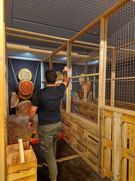 The group went ax (and shovel!) throwing and discovered that hitting the target is harder than it looks!